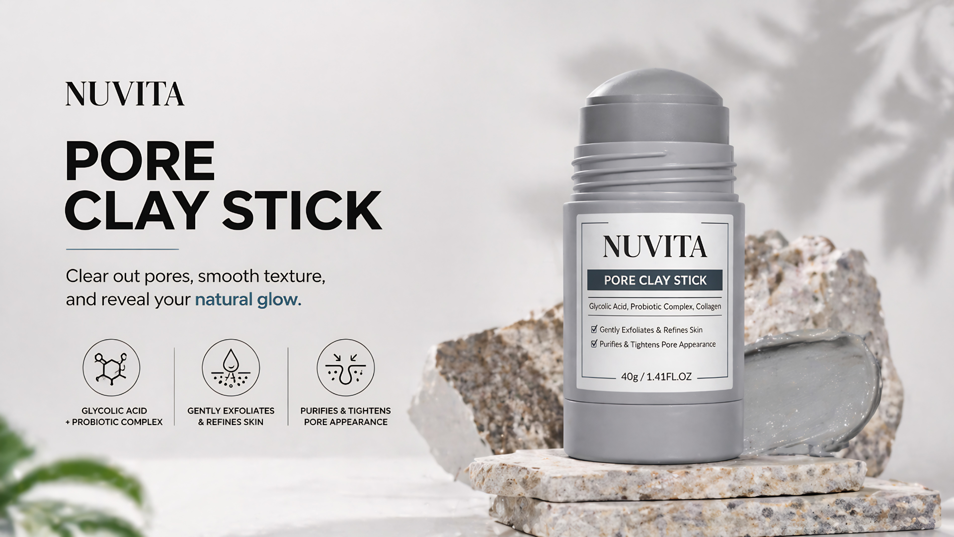 At Nuvita, we believe in real clarity—no shortcuts, no fuss. Our Pore Clay Stick is thoughtfully crafted with premium ingredients designed to refine your pores and give you that smooth, glowing complexion you’ve been searching for.